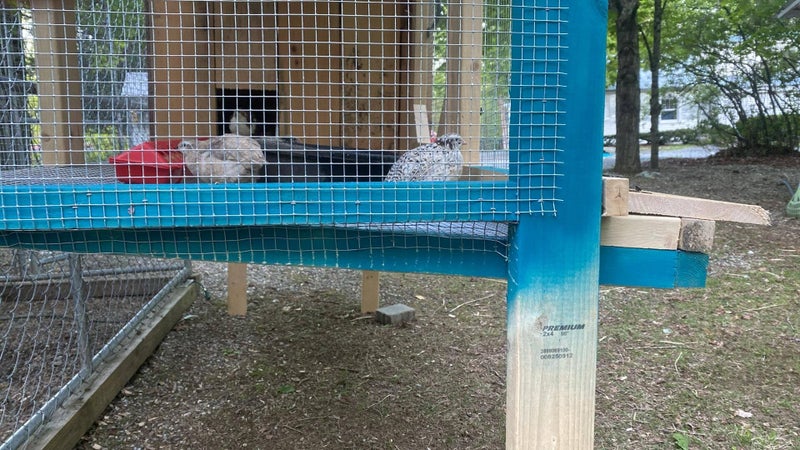 Quail? Yes quail. Tiny little quail. They have moved out of the brooder and into their new home. The quail house features a slightly sloped floor that, in theory, should allow the quail eggs to roll down into the box in the front once they are laid. The pitch is slight and should not pose an issue for the birds to walk on. Mr. built this coop in the driveway and with the help of his son carried it over to place it. It's a good thing that Mr. has strong sons.